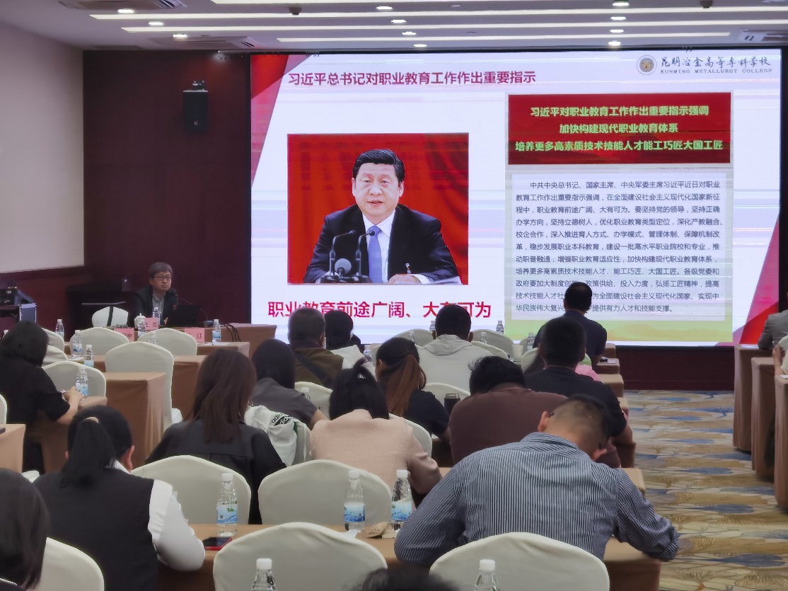 王旭处长立足职业教育高质量建设,结合十三五以来党中央对职业教育的指示批示,以昆明冶金高等专科学校为例,探析了职业教育高水平专业群建设的路径,指出专业群建设要充分聚焦云南省“3815”战略发展目标规划,并进一步对“双高计划”建设做出讲解。