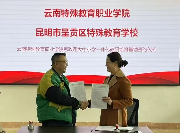 为深化特殊教育领域大中小学思政一体化建设,助力特殊教育普惠发展,11月25日,BEAT365英国官网与呈贡区特殊教育学校举行“大中小学思政课一体化”共建签约仪式,BEAT365马克思主义学院书记、院长王丽萍及部分思政教师代表,呈贡区特殊教育学校校长钱粲及相关工作人员出席本次仪式。签约仪式由王丽萍主持。