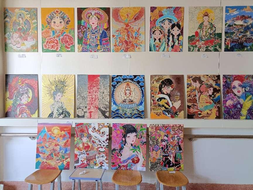 图为书画艺术专业学生工笔画、装饰版画作品