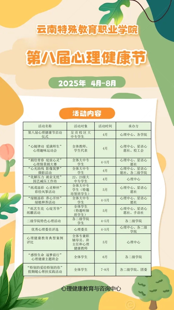 为了更好地发挥心理浸润作用,心理中心还积极策划了学校第八届心理健康节系列活动。本次活动以“心暖四季,爱满校园”为主题,旨在通过多元化的心理健康教育活动,深化“全员育人”理念,构建关爱学生心理健康的校园文化生态。心理中心通过“以智启心,以美润心,以劳育行,以体强心”四维融合,加强活动创新,既注重专业性与趣味性的平衡,更践行“全员参与、全程浸润、全向赋能”的育人理念。