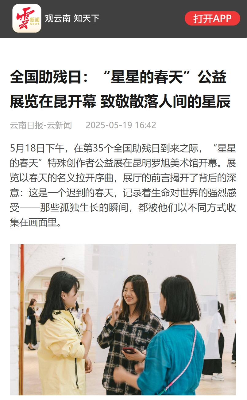 “星星的春天”特殊创作者公益展由《春城晚报》与罗旭美术馆共同发起,13名参展作者来自云南特殊教育职业学校及社会各界,总计137幅送选作品涵盖油画、水彩、剪纸、手撕篆书等纸本创作形式。本次特展将持续至5月25日。