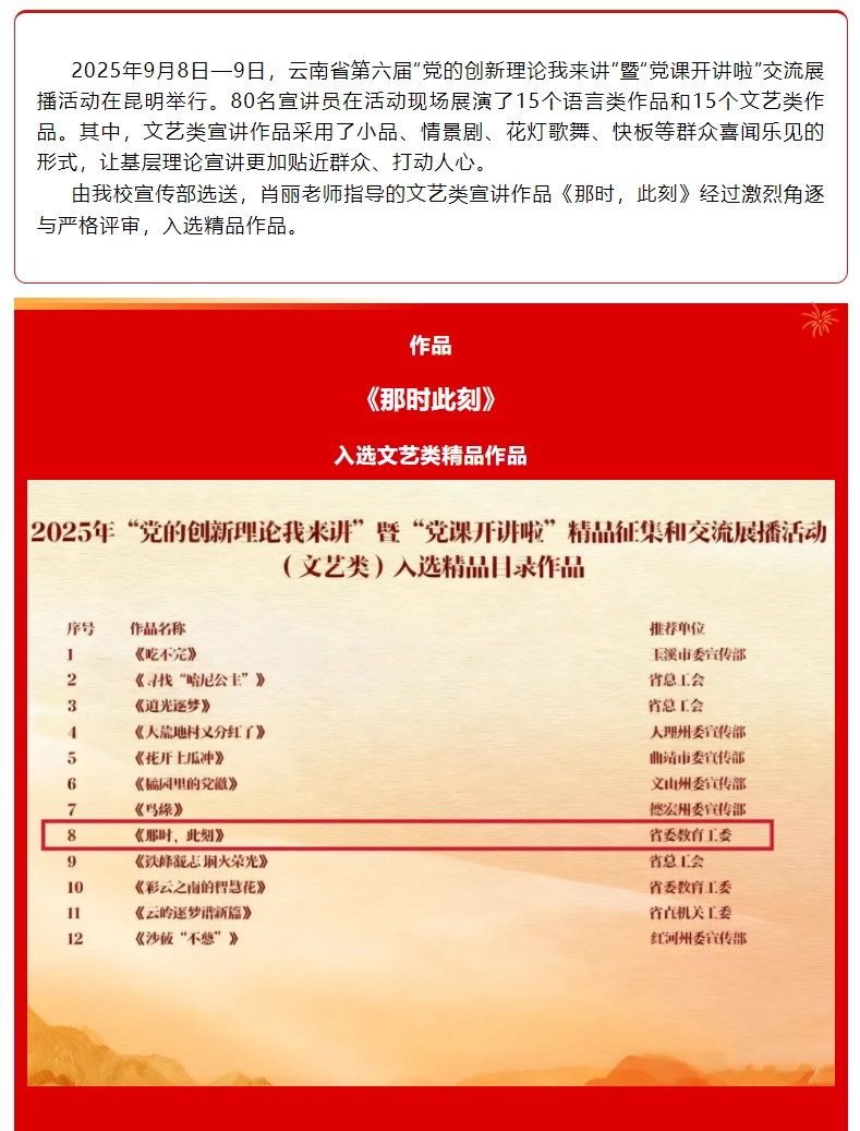 喜报!BEAT365文艺类作品《那时,此刻》入选云南省第六届“党的创新理论我来讲”精品征集和交流展播活动精品作品