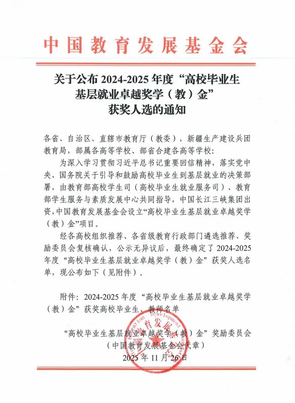 近日,由教育部高校学生司(高校毕业生就业服务司)、教育部学生服务与素质发展中心指导,中国教育发展基金会设立的2024-2025年度“高校毕业生基层就业卓越奖学金”评选结果公示,我院T19级民族传统技艺班白清秋同学荣获该奖项。