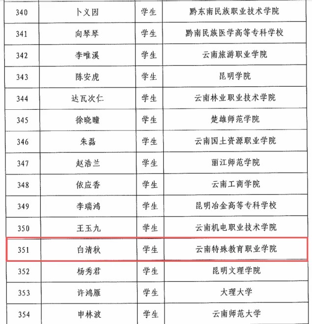 白清秋同学为彝族,1999年6月出生,中共预备党员。在校期间,她潜心钻研传统技艺,毕业后积极投身基层,现任楚雄州南华县七彩彝绣文化传播有限责任公司设计师。她将专业所学与基层发展需要紧密结合,在彝绣文化的传承、创新与推广一线踏实工作,以实际行动响应国家鼓励高校毕业生服务基层的号召,展现了当代青年的使命担当。 此项荣誉不仅是对白清秋同学个人专业能力与奉献精神的肯定,也是我院长期以来坚持立德树人、引导学生服务基层、成长成才的育人成果体现。希望白清秋同学再接再厉,在基层岗位上继续贡献智慧与力量。在此号召全体同学以她为榜样,树立扎根基层、服务社会的就业观,让青春在祖国需要的地方绽放光彩。