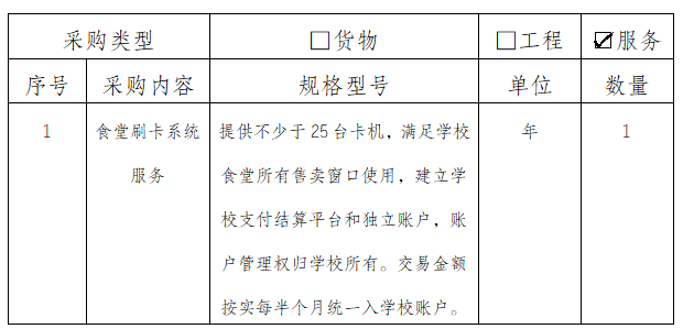 为便于学校食堂收取餐费,公开透明完成食堂账户费用结算,提高食堂就餐效率,保障食堂高效安全运行,结合食堂工作实际,具体采购需求如下: