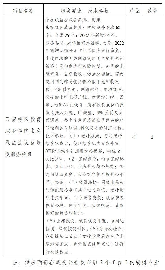 三、供应商资格要求注:供应商需在成交公告发布后3个工作日内安排专业技术人员到学院现场对未在线监控设备进行全面勘探,并根据学校要求明确修复方案。
