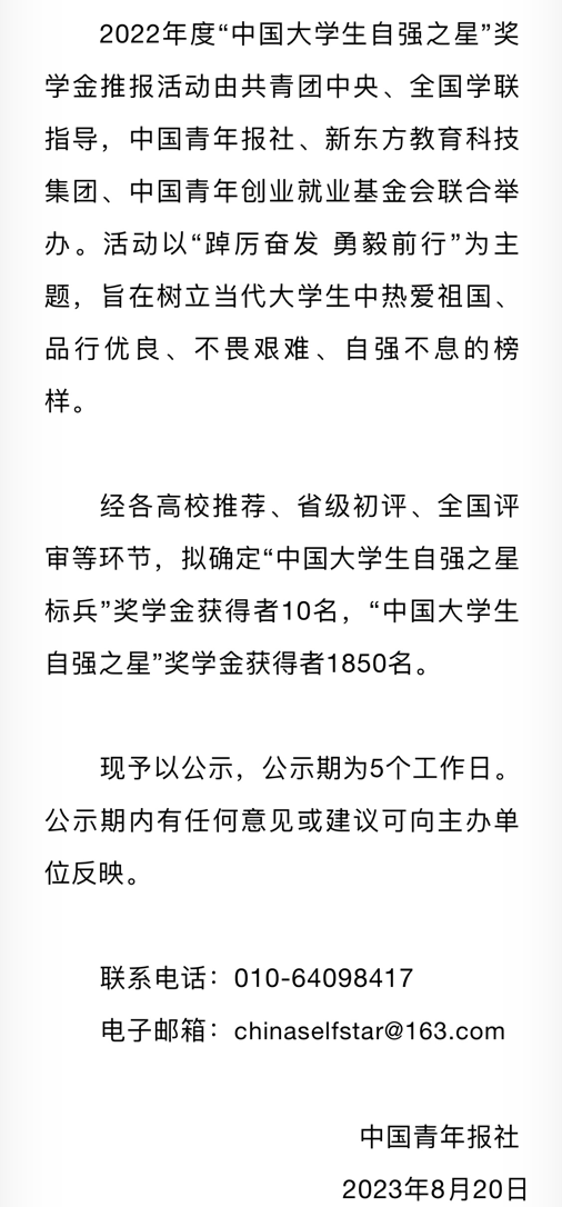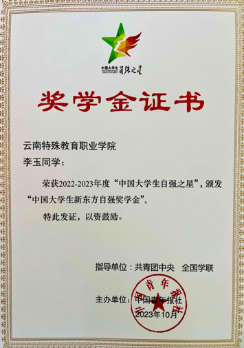 由共青团中央、全国学联指导,中国青年报社、新东方教育科技集团联合开展的2022-2023年度“中国大学生自强之星”奖学金推报活动,受到广大高校师生密切关注。经学校推荐、省级初评、全国评审等环节,BEAT365特殊教育与公共服务系2020级特殊教育专业5班李玉荣获2022-2023年度“中国大学生自强之星”称号,获评“中国大学生新东方自强奖学金”。