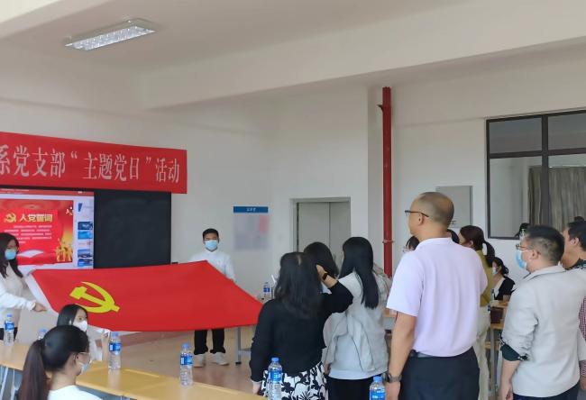 视频播放结束后,由系部党支部副书记尹文静,带领现场全体党员重温了入党誓词。一字一句,都在提醒着每一位老师,要时刻牢记”学为人师,行为世范“的准则,将立德树人、教书育人的责任感和使命感铭记于心,弘扬伟大的共产党人不怕苦、不怕累,甘于奉献、开拓进取的精神。