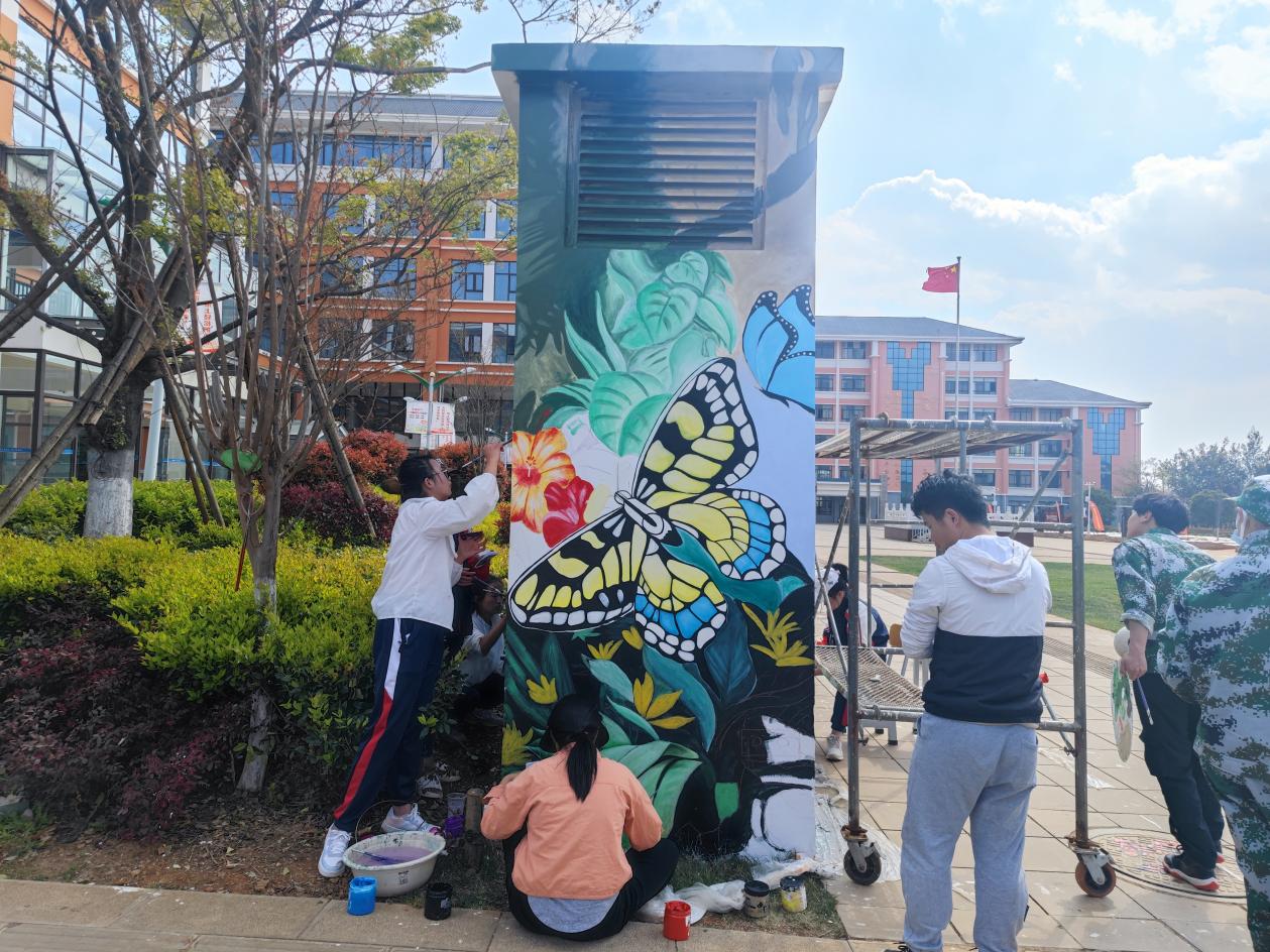 本次活动共10名支部党员带领52名学生完成了6个通风井墙面绘制,图案围绕生物多样性主题结合本季节春意黯然、百花齐放的风景特点设计,支部党员完成设计后交由学生小组完成具体彩绘实践,在绘制过程中,学生们充分结合自身专业特长和墙绘具体要求灵活调整技术技法,一方面是对自己专业能力的一次实践性检验;另一方面也为各专业学生提供了一个专业技能横向比对的机会,至此校园里又多了6幅美丽的画卷,至此艺术系党支部党建引领业务发展又多了一个渠道和平台。