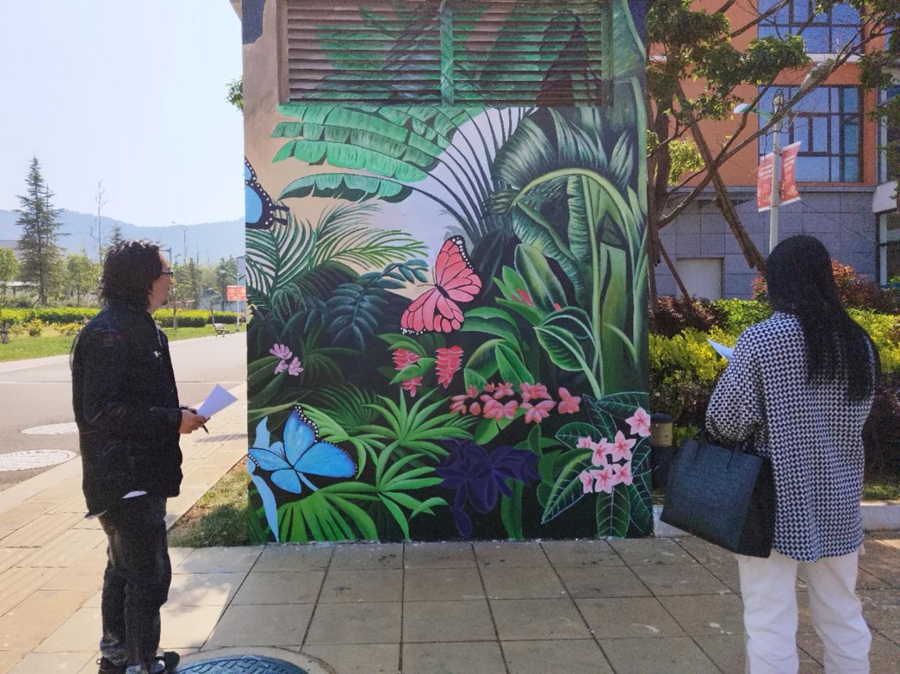 艺术系书画专业教师钟波、尹德慧老师为墙画评分