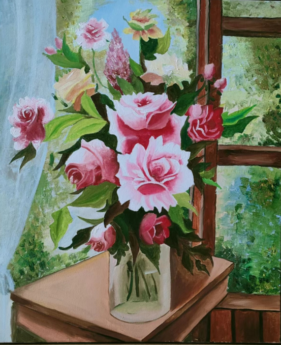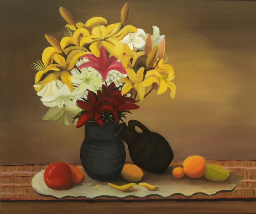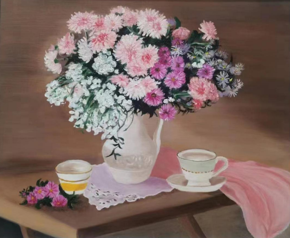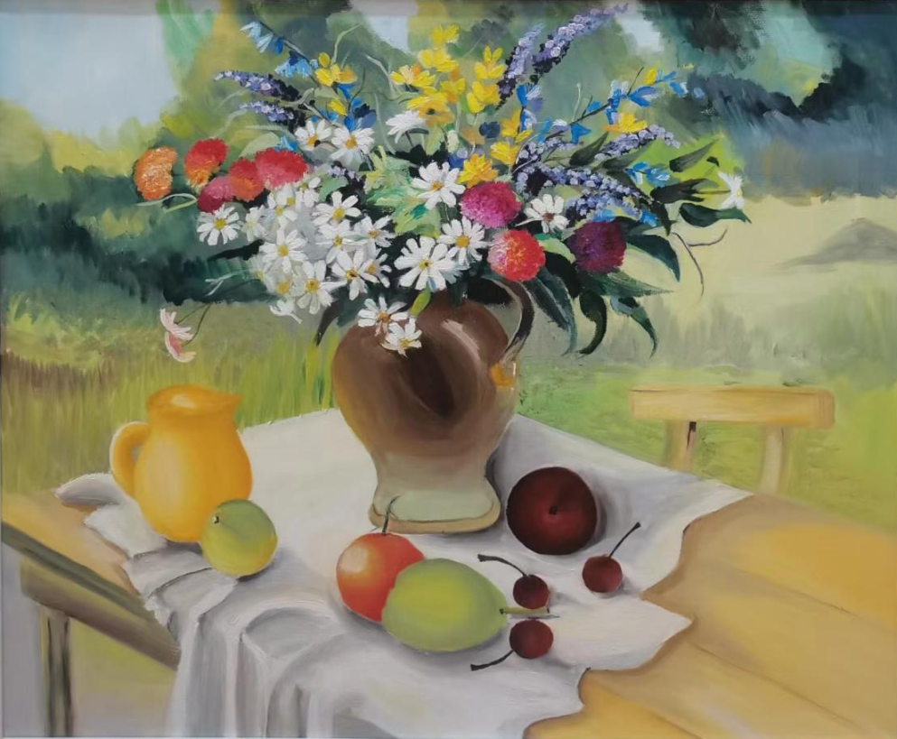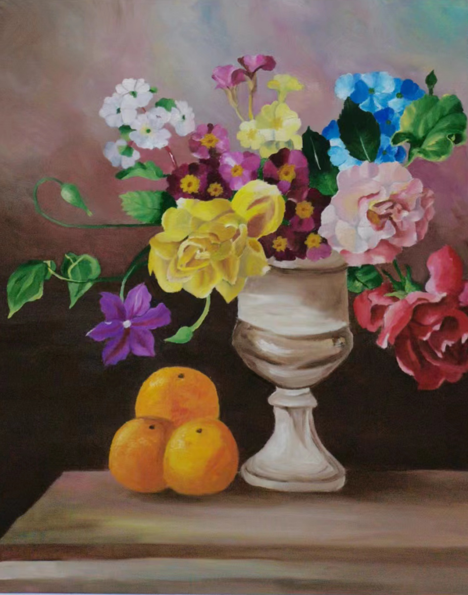 作品具有一定的学术性和创新性,在创新性方面表现得特别突出,给人予耳目一新的感觉。学生用油画材料在布面上绘制花卉、水果、花鸟、动物及精美的果盘瓷器等,创意新颖,装饰性较强,色彩灿烂,把油画技能和生活中自己感兴趣的所有物件巧妙结合在一起,体现了绘画和实物的巧妙结合,在训练学生动手能力的同时,又培养了学生的想象力和创造力。创作方法较规范,充分利用了以前所学的绘画技法。存在的问题及不足之处是,造型还可以再大胆、现代一些,用色可以再灿烂、鲜艳一些,细节刻画可以更细腻一些。