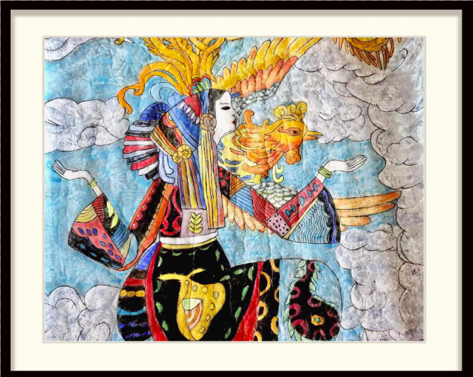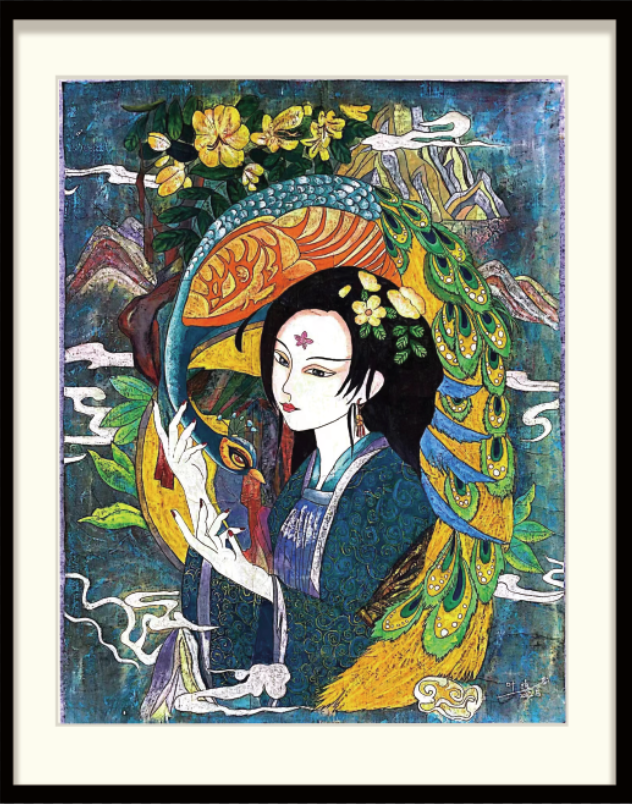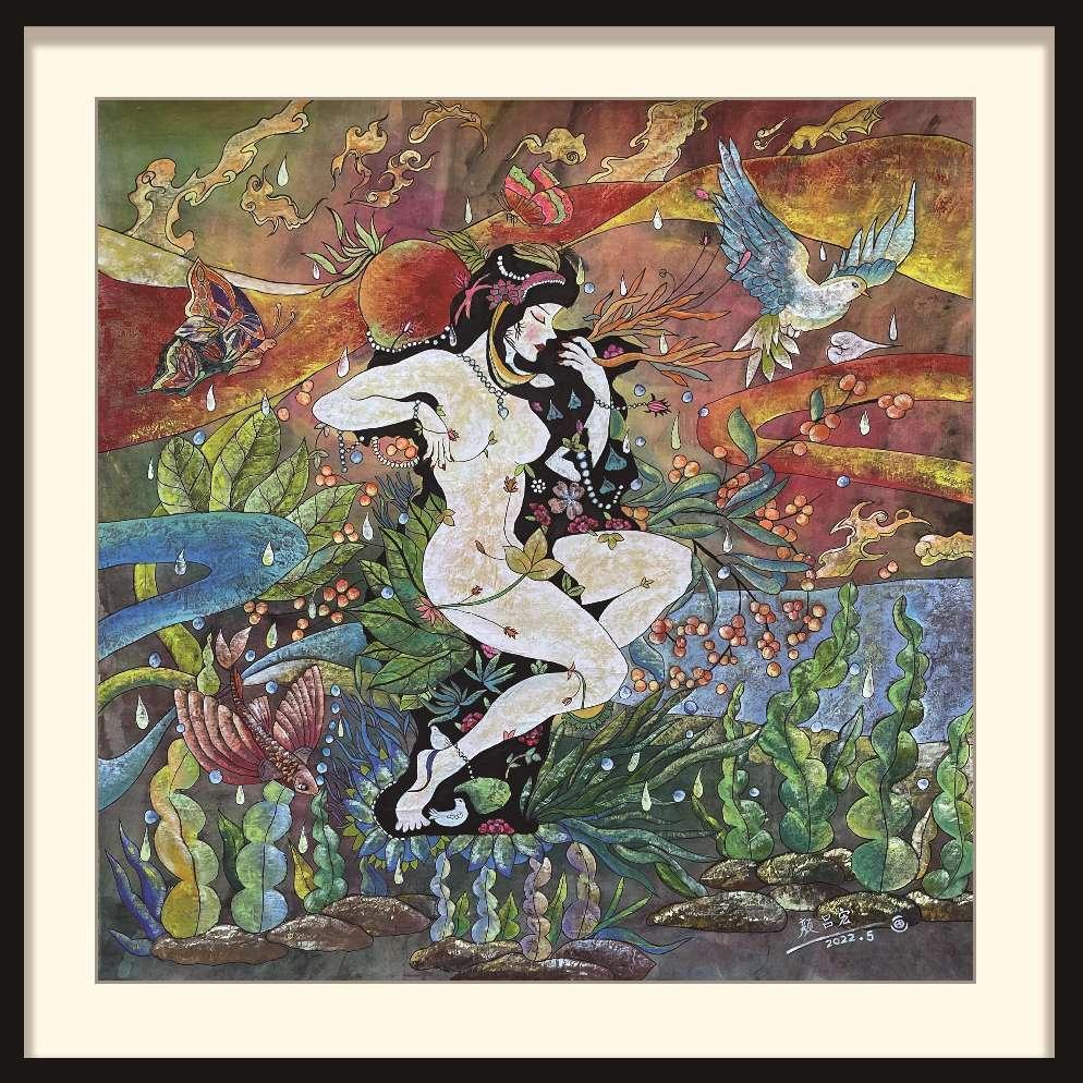 设计主题:《镜水夜来秋月 女娲少女》重彩画创作