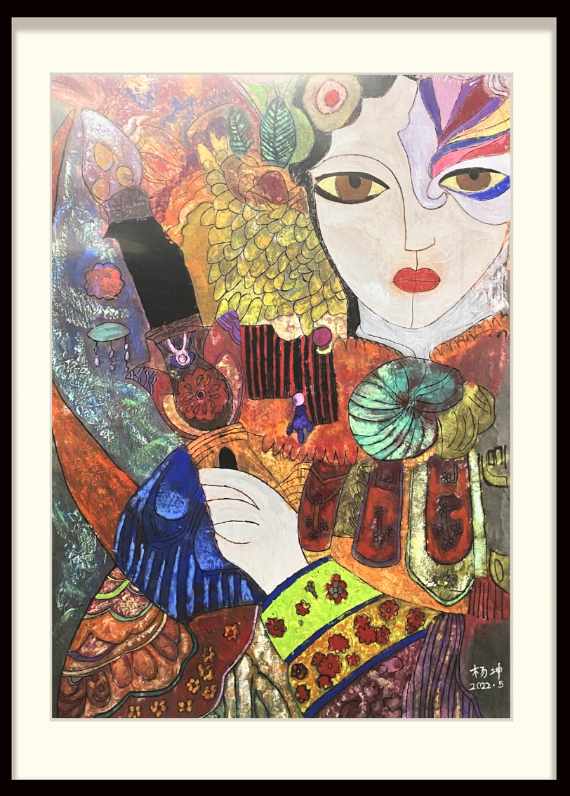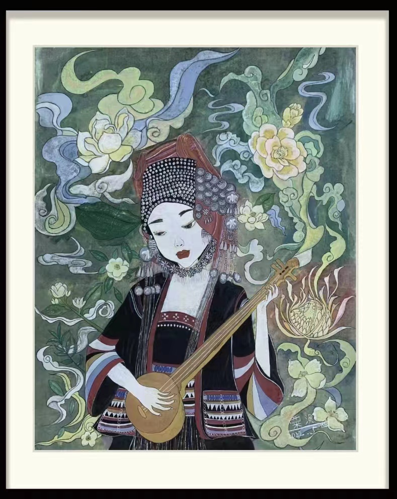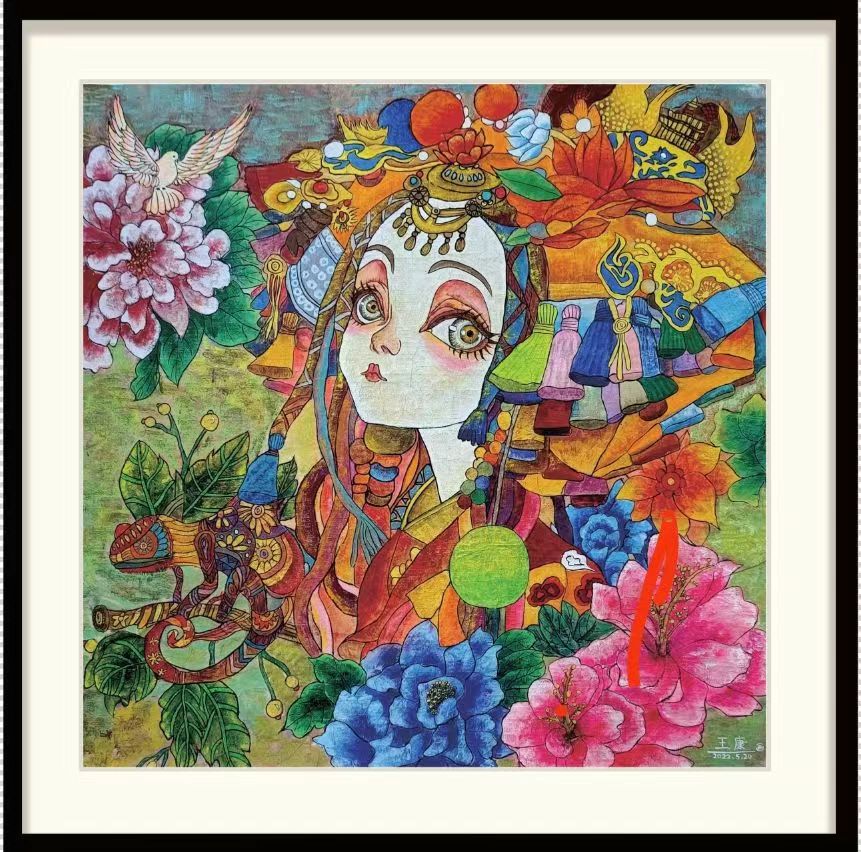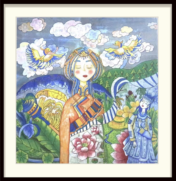 这幅作品采用了现代重彩的绘画形式来表现,围绕传统文化为主题,运用敦煌莫高窟风情和云南民族风情为素材进行创作。