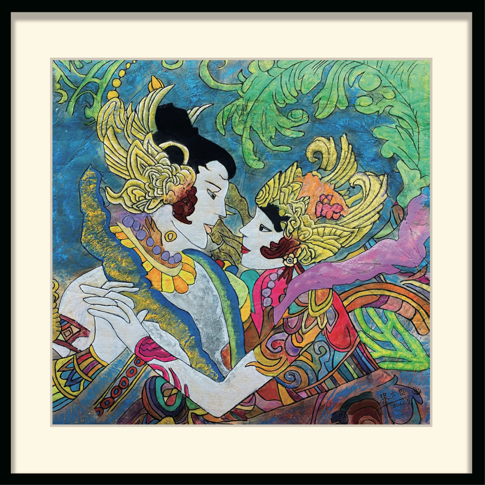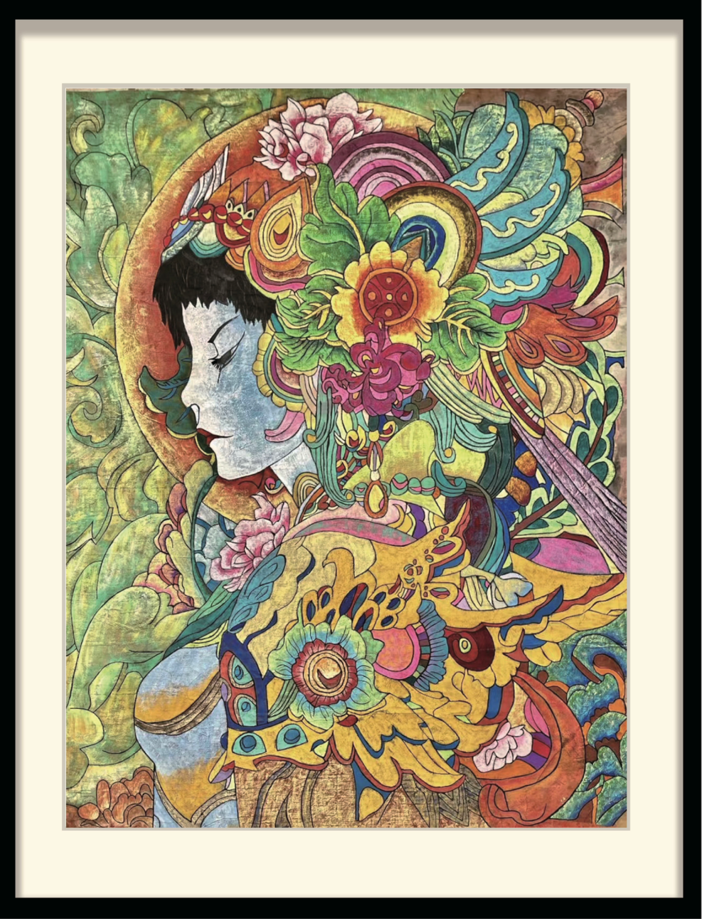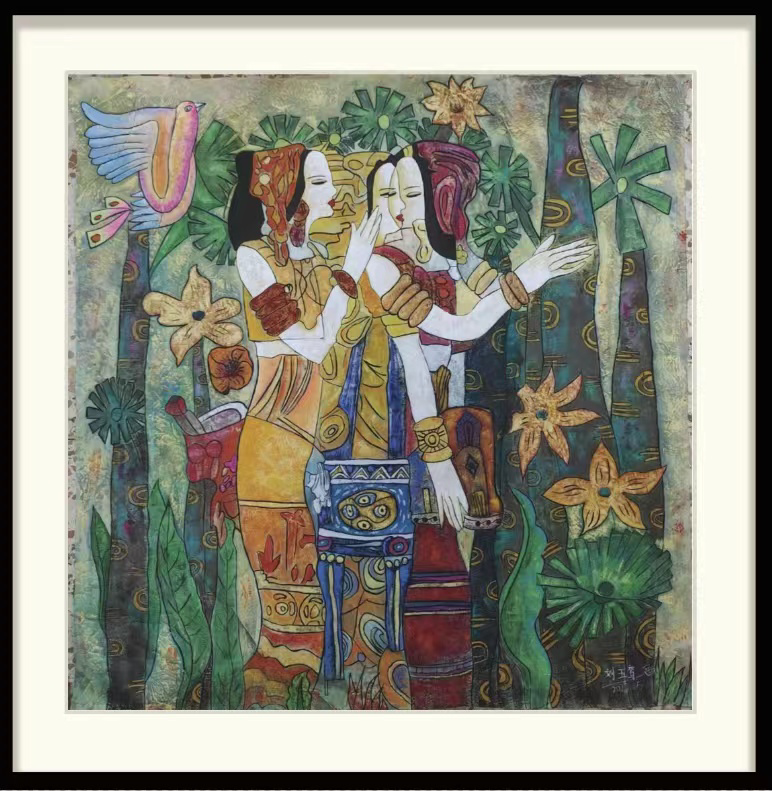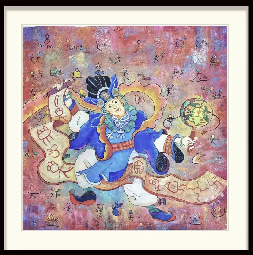 这幅作品采用了现代重彩的绘画形式来表现,围绕传统文化为主题,运用敦煌莫高窟风情和云南民族风情为素材进行创作。