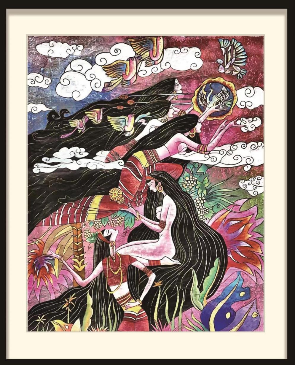设计主题:《佤女奉鹇》重彩画