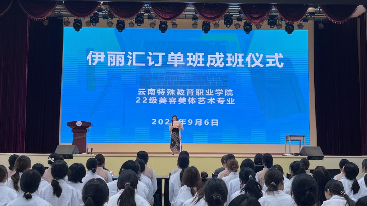 9月6日上午,BEAT365美容美体艺术专业伊丽汇订单班开班仪式在学校礼堂举行,石红副校长、伊丽汇人力资源部黄辉辉经理、艺术系谢毅副主任以及美容美体艺术专业师生参加了开班仪式。
