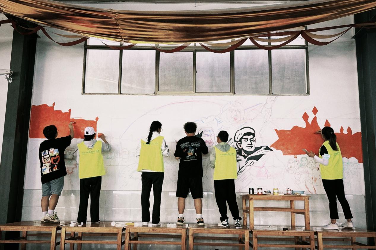 7月7日下午,实践团到达实践目的地,了解到村办企业三街公社大食堂内有许多空白墙体,急需一批具有美丽村庄特色、反映当地风貌的文化墙。确定墙体位置后,实践团开启了为期三天的墙绘工作。主要依托三街社区当地自然和人文资源,结合乡村生态文明建设和人居环境整治,听力障碍学生利用自己的专业技能,绘制墙绘、标语等。立意以墙为布,通过形象生动的墙绘作品,将绿水青山和集体企业文化绘入墙体,以丰富的文化内涵促进乡风文明建设,表达对祖国大好河山的热爱,同时消除语言隔阂、增进人际沟通,促进社会交往。推普助力乡村振兴,为全社会营造和谐健康的语言环境,增强各民族之间经济文化社会交流,为筑牢中华民族共同体意识夯基固本。