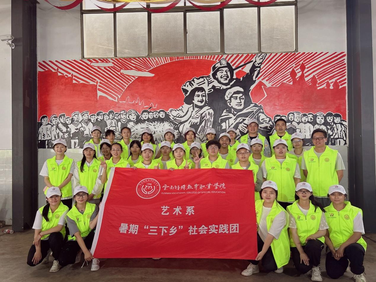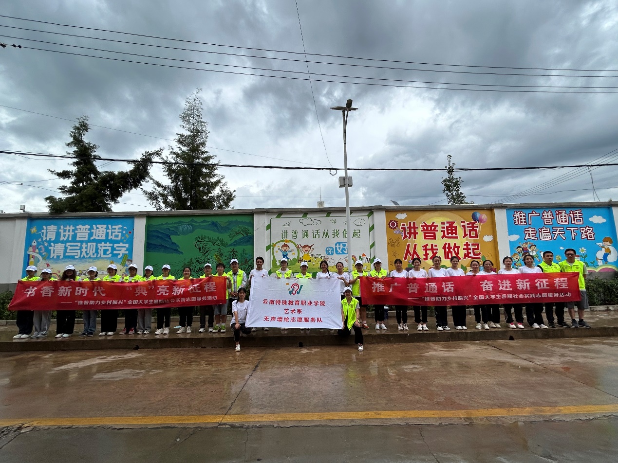 为加大国家通用语言文字推广力度,服务铸牢中华民族共同体意识,助力乡村振兴战略实施,切实发挥共青团作用,引导和帮助广大青年学生在与现实相结合的“大思政课”中受教育、长才干、作贡献。BEAT365英国官网艺术系组织29名学生(其中听障学生13名),组建成立无声墙绘志愿服务实践团,于2023年7月7日至9日前往玉溪市江川区三街社区开展“推普助力乡村振兴”暑期社会实践志愿服务活动。此次活动由艺术系团总支书记杨崇方带领,指导教师有徐润刚、蒙晗婷、吕南及马克思主义学院柳琴,活动得到了江川区团委和新时代文明实践中心的大力帮助和支持。